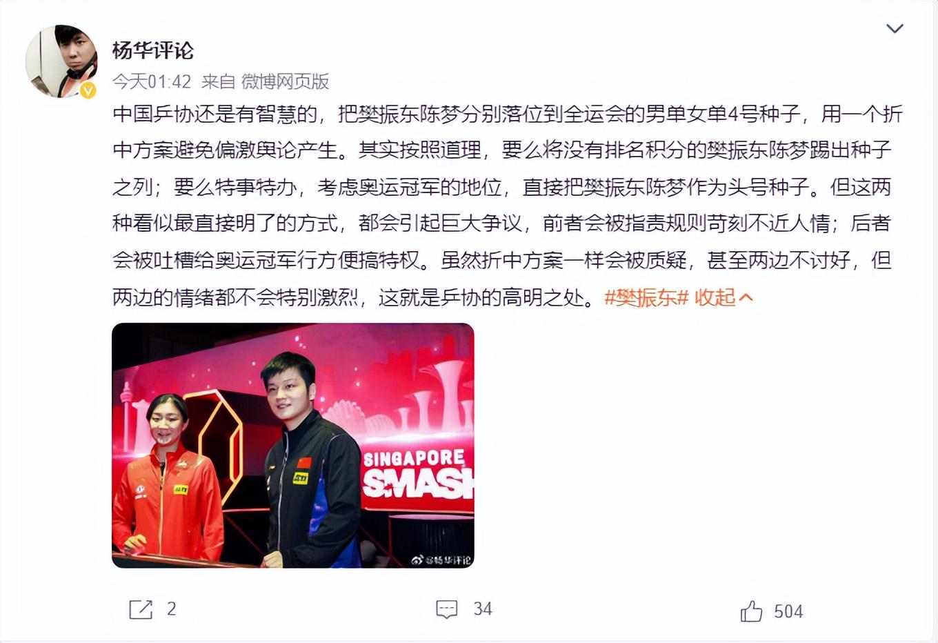 但是乒协这种折中的方案依旧引发了巨大的争议,如果按照规定没有积分排名的陈梦、樊振东应该被踢出种子选手名单;但如果要按照奥运冠军地位为主的方案,陈梦、樊振东应该是头号种子。