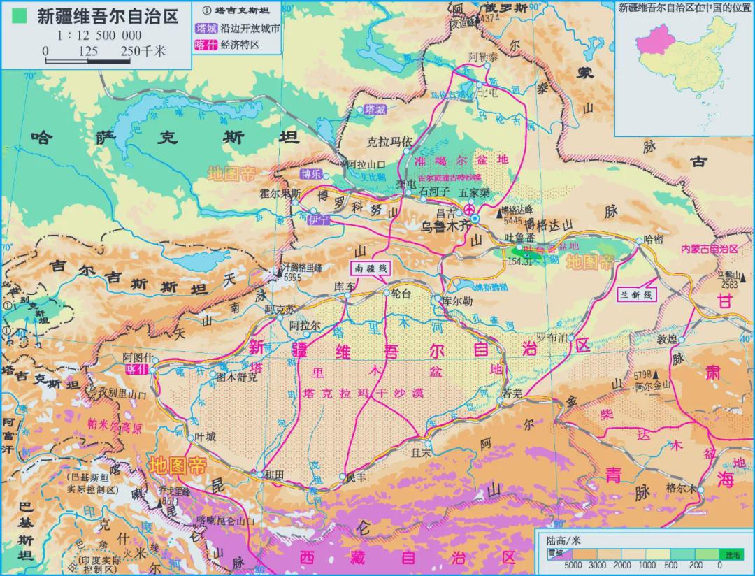 新疆维吾尔自治区,位于中国西北部,地处亚欧大陆腹地,面积约166.49万平方千米,居我国第一位。