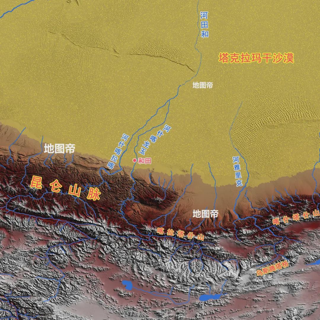 和田地势南高北低配查信,南部雄伟的昆仑山成弧形横贯东西,中部为峡谷遍布的山前坡麓地带,北部为塔克拉玛干沙漠,由南部山地7167米下降到北部1050米。